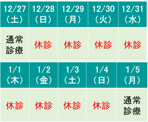 年末年始 外来診療のご案内 2025年11月04日 12月28日(日)~1月4日(日)は外来診療休診とさせていただきます。 年内最終診療日は12月27日(土)、年明けは1月5日(月)より通常診療となります。 ご確認の程よろしくお願いいたします。 お知らせ一覧へ