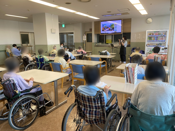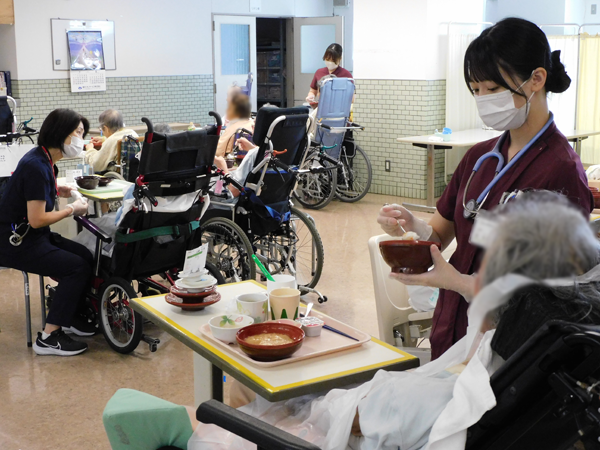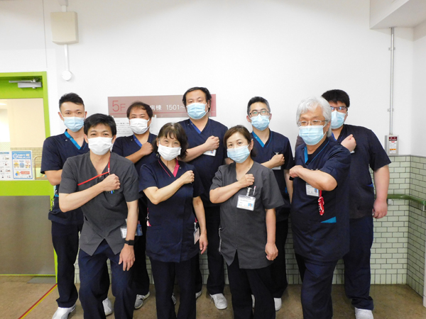 本館5階病棟は特殊疾患療養病棟で、神経難病患者様が多く入院しております。より良い看護が提供できるように、病棟担当の薬剤師を交えてカンファレンスを開催しています。長期療養の患者様が多く1日の大半をベッド上で過ごしているため、昼食は人工呼吸器を装着している患者様もホールで食事を楽しんでいただけるように援助をしています。また、理学療法士の協力を得てリハビリ室での訓練もしております。スタッフには推し活などでプライベートが充実できるように協力して、WLB・ヘルシーワークプレイスを目指しています。