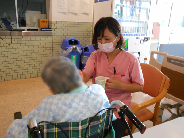 療養4階病棟は精神科急性期認知症病棟です。認知症看護は、患者様の中核症状や周辺症状を理解するだけでなく、その方の背景や嗜好といった特徴を知ることから始まります。ご家族からお話を伺い、医師やコメディカルとアプローチや支援を整えます。また患者様だけでなく、ご家族も安心して暮らせるよう公的機関とも連携し、患者様がまた社会に戻って生活できるよう支援をしています。スタッフは日頃からよく声を掛け合い、患者様とも明るく対応できる優しい病棟です。